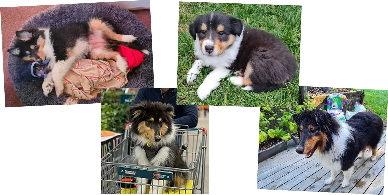 外で木の枝やオモチャを加えて走り回ったり、ホースの水遊びが大好き。何故かコンクリート床のような光ったものを怖がり歩きたがらない。初めてBunningsに行った時には歩きたがらないので、トローリーに乗せてお買い物。