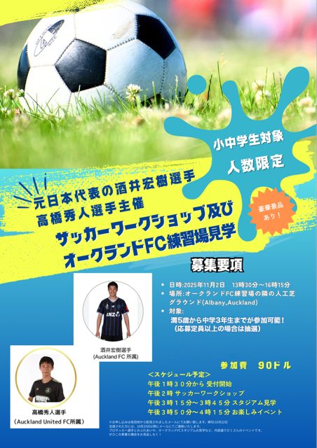 元日本代表オークランドFC所属酒井宏樹選手、高橋秀人選手主催のサッカーワークショップ及びスタジアム見学開催!満5歳から中学3年生までが参加可能です。